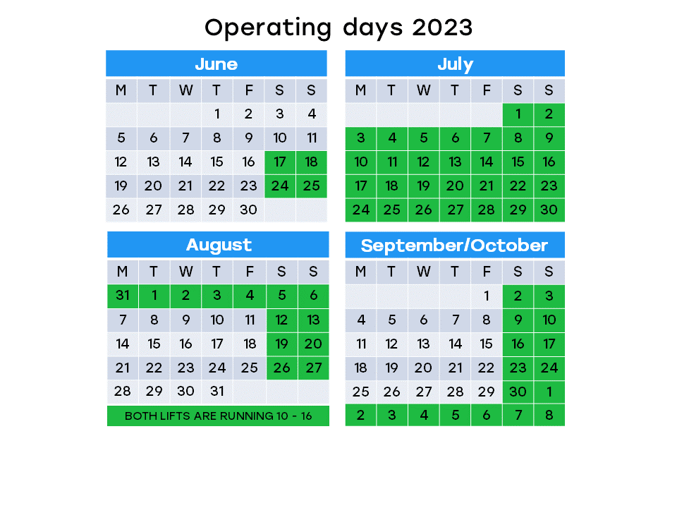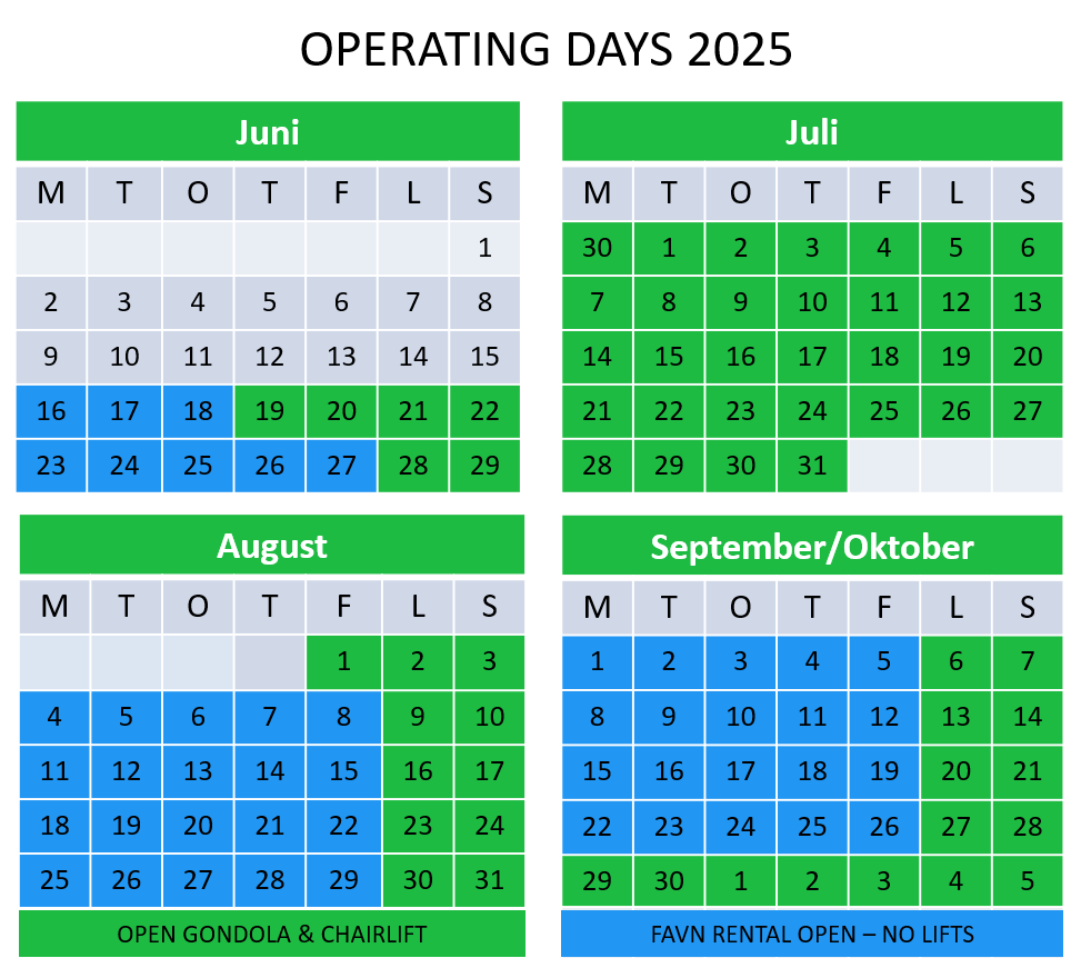 • On blue opening days, there are no lifts, but Favn rental is staffed from 09:30 - 15:00 (bicycles can be kept until 18:00)
