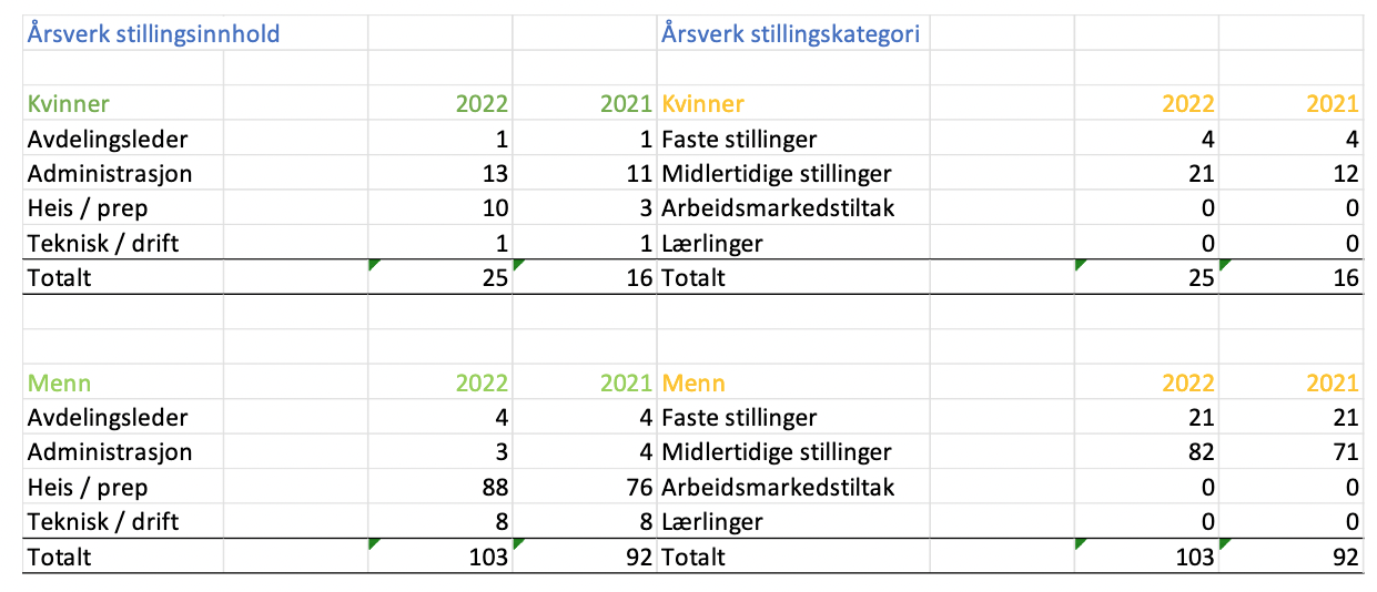 Faste ansatte er i hovedsak ansatt i fulle stillinger. Men som følge av vår virksomhets karakter er det utbredt med deltidsstillinger blant våre sesongansatte. Det er likevel en stor andel av sesongansatte som arbeider fulltid i kontraktsperioden, slik at andelen som arbeider på henholdsvis fulltid og deltid er like stor. Den faste stab utgjør 27 personer (4K / 21M) – herav 2 på frivillig deltid (K). I vintersesongen 22/23 ble det sysselsatt i gjennomsnitt 66 årsverk pr. måned fordelt på 112 sesongansatte.